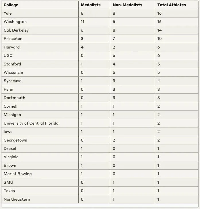 The Olympic Games have long been a showcase of the world's top athletic talent, and rowing is no exception. In recent years, the influence of U.S. collegiate rowing programs has become increasingly evident on the Olympic stage. Lets look at the numbers behind U.S. college representation in Olympic rowing and examine their impact on medal success. These numbers guide us to the colleges that best develop athletes and prepare them for the international stage. It also gives a guide as to why so many young athletes see studying in the U.S. as a place to develop athletically preparing them for the world stage.
